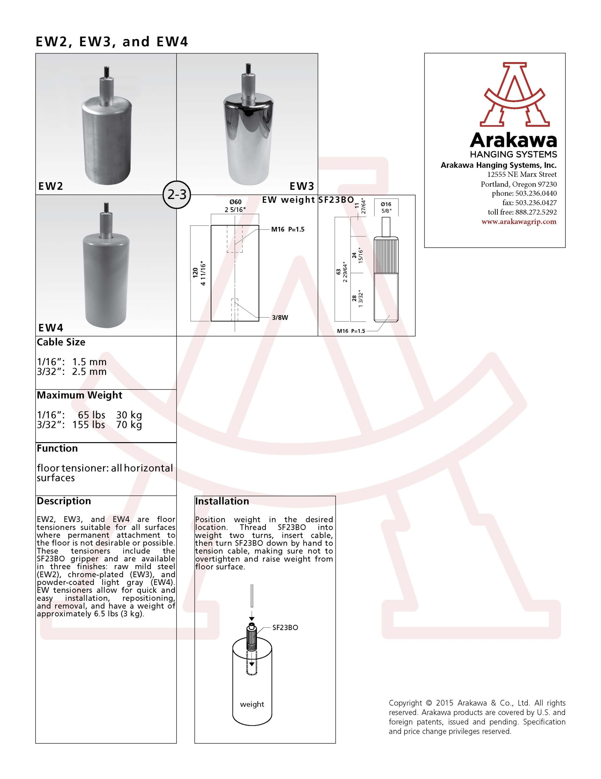 EW-type tensioners are intended for use (with the SF23 tensioner) where a permanent attachment to the floor is not desired or possible. They allow for quick and easy installation, reposition and removal or cable hung artwork and photos, signage and graphics, shelves, privacy screens and/or room dividers. EW2, EW3 and EW4 have a height of 4 11/16″, base diameter of 2 5/16″, and a weight of approximately 6.5 pounds (3 kg). The EW4 is finished in grey powder coating.
