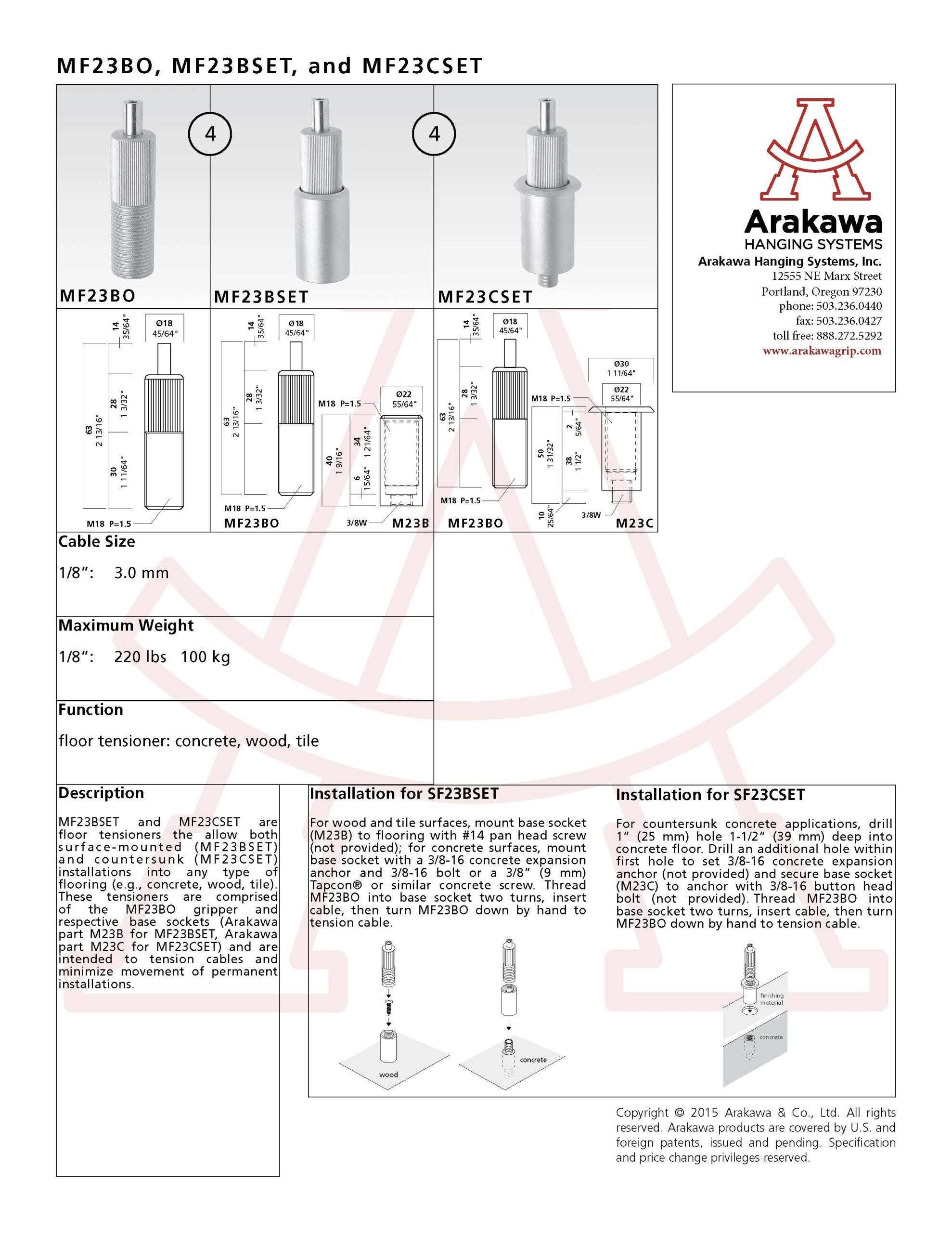 MF23 is is a lower profile floor tensioner. Use it to tension cables to minimize the movement of displays. The MF23CSET includes a countersunk mounting base for concrete. Drill first hole in concrete to accept the base. Then drill a second hole to accept an anchor. The base includes a 3/8-16 threaded stud to secure the base to the anchor.